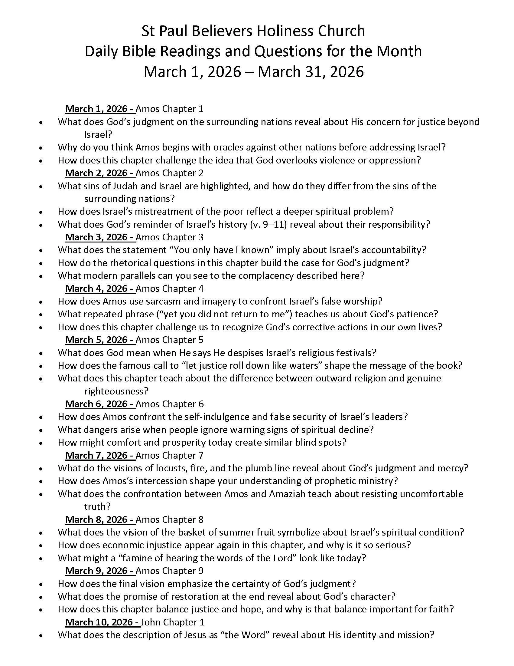 St Paul Believers Holiness Church Daily Bible Readings and Questions for the Month March 1, 2026 – March 31, 2026 Sunday, March 1, 2026 6:00 PM 18:00 Tuesday, March 10, 2026 7:00 PM 19:00 Google Calendar ICS